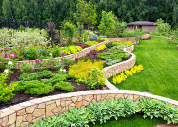 Closeup of Professionally Landscaped Flower Bed with Decorative Green Garden Plants and Evenly Mowed Lawn in the Background.